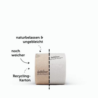 Dürfen wir vorstellen? Goldeimer Klopapier ist jetzt aus recycelter Kartonage – ungebleicht und noch weicher als vorher. Hier gibt’s eine Übersicht über die Neuerungen am und im Goldeimer Toilettenpapier inklusive wieso, weshalb, warum.